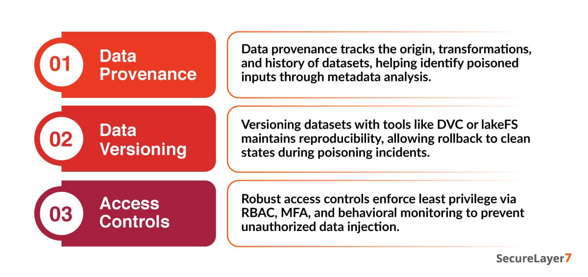 Strong dataset validation mechanisms act as a frontline defense against poisoning. This includes verifying data provenance, checking label consistency, detecting duplicate or near-duplicate samples, and validating schema and feature ranges.