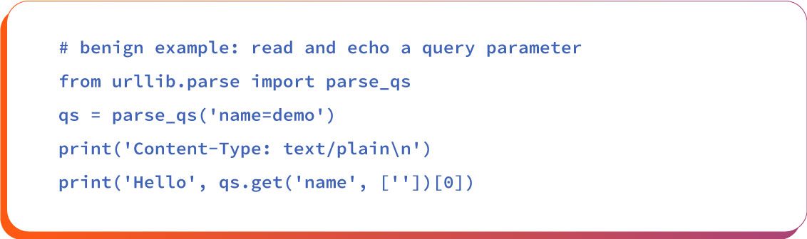 This Python/CGI script has a query parameter from the URL that is parsed using parse_qs. It demonstrates how web servers handle input data, how weak validation can be abused, and why sanitizing input is important.